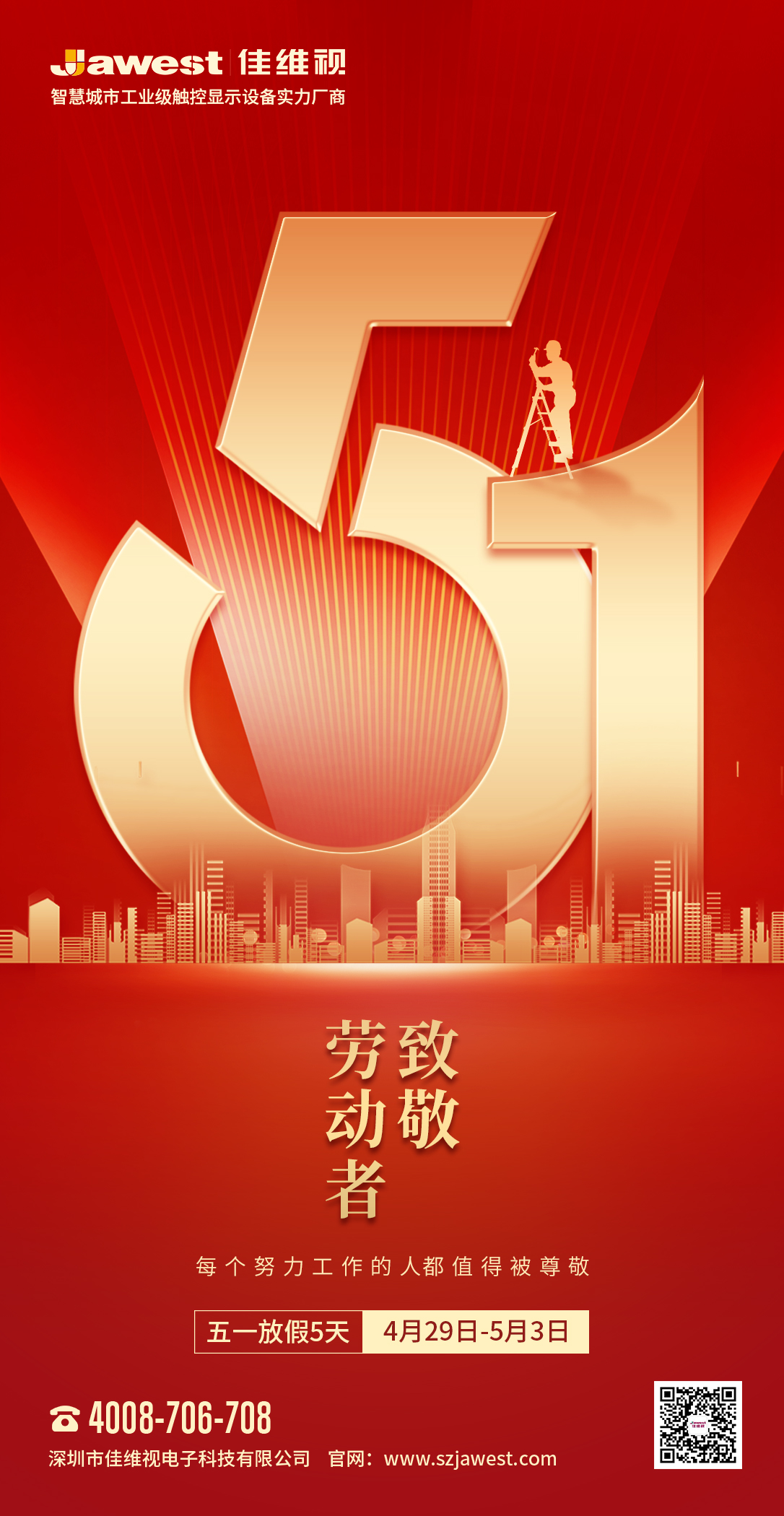佳維視2023年五一放假時間: 2023年04月29日至2023年05月03放假調休共5天; 2023年05月04日正常上班,2023年05月06日(星期六)補班; 放假期間注意事項:假期外出請注意人身、財產安全; 產品咨詢可以撥打電話:18899774840。 五一快樂!!~~~