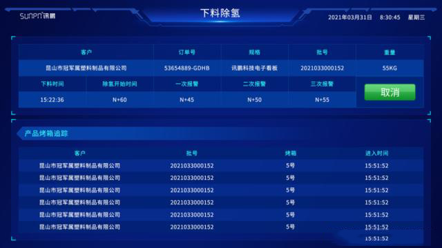 6、手機APP需要顯示:客戶,訂單號,重量,規格,批號,下料時間,除氫開始時間,一次報警時間,二次報警時間,三次報警時間,烤箱追蹤也顯示,客戶,批號,烤箱號,進入時間。