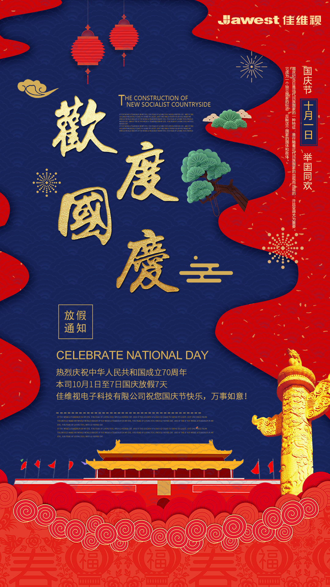 國慶假期將至,根據(jù)國家法定假期的規(guī)定,并結(jié)合公司的實(shí)際情況,佳維視電子針對(duì)2019年“國慶”放假時(shí)間為10月1日至10月7日,放假7天,10月8日正常上班。