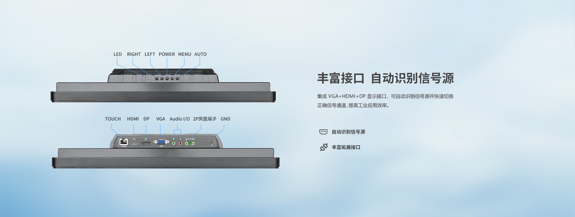 DP顯示輸入接口。IP65純平前面板+鋁合金壓鑄外殼,