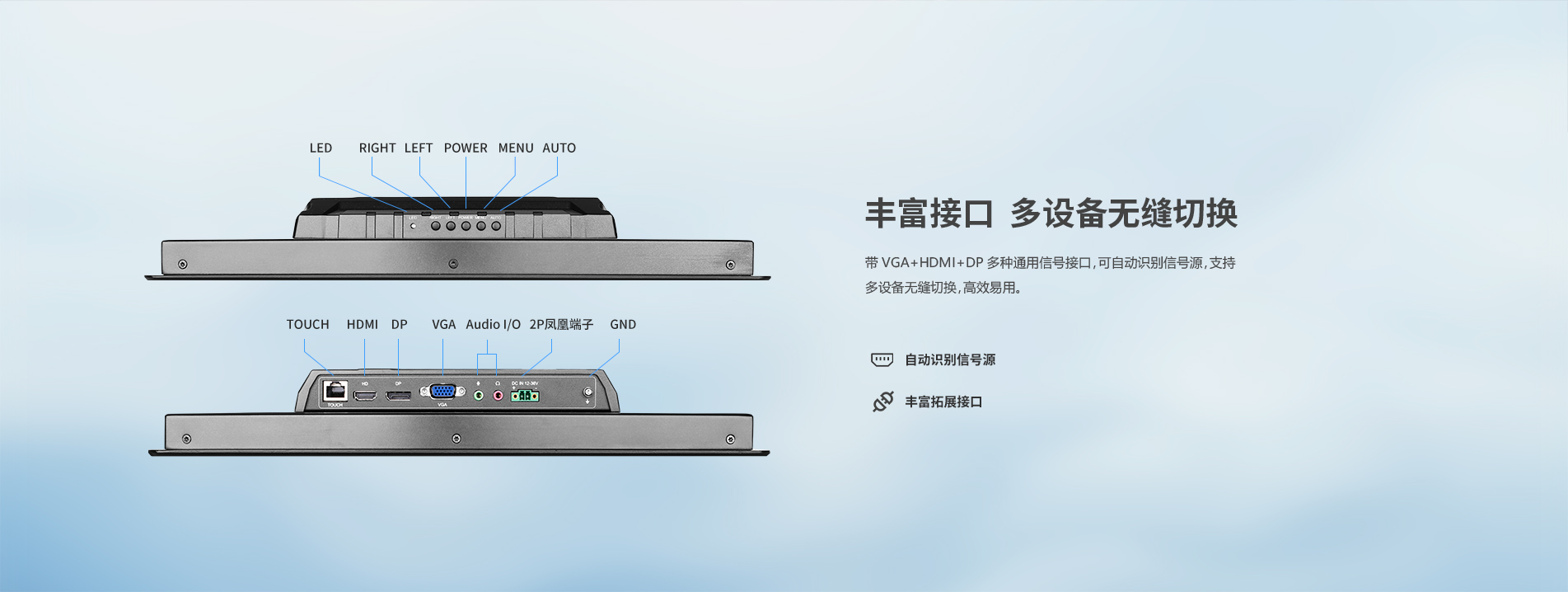 摸選配,帶VGA+HDMI+DP信號接口。鋁合金壓鑄外