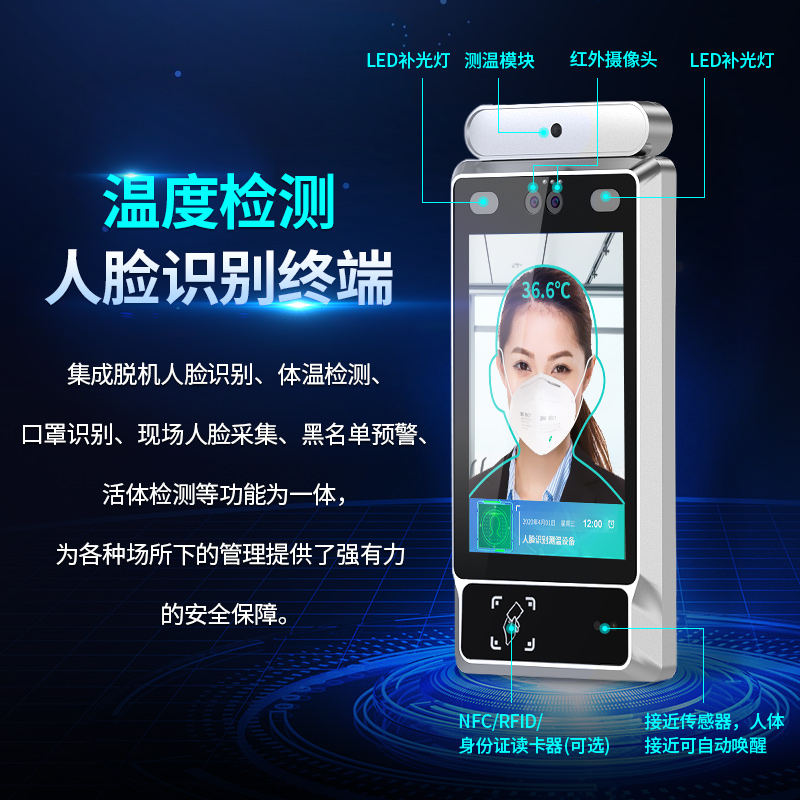 人臉識別測溫門禁一體機,配套人行通道閘機使用,組成人體測溫閘機通道結合門禁、訪客、考勤等模塊使用,用于各種大廈、醫(yī)院、學校、工廠等場合,AI智能守護安全 助力防疫。同時,該設備配備溫度檢測儀,可在進行人臉識別的同時,對被識別人進行體溫監(jiān)測,獲取人員的體溫信息,從而判斷該人員是否生病、有無健康問題,可廣泛應用于醫(yī)療衛(wèi)生領域,可以有效監(jiān)測因新型冠狀病毒患上新型肺炎導致的異常發(fā)熱,體溫異常上升。